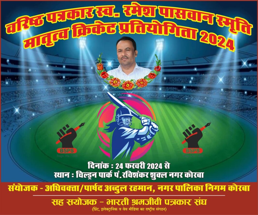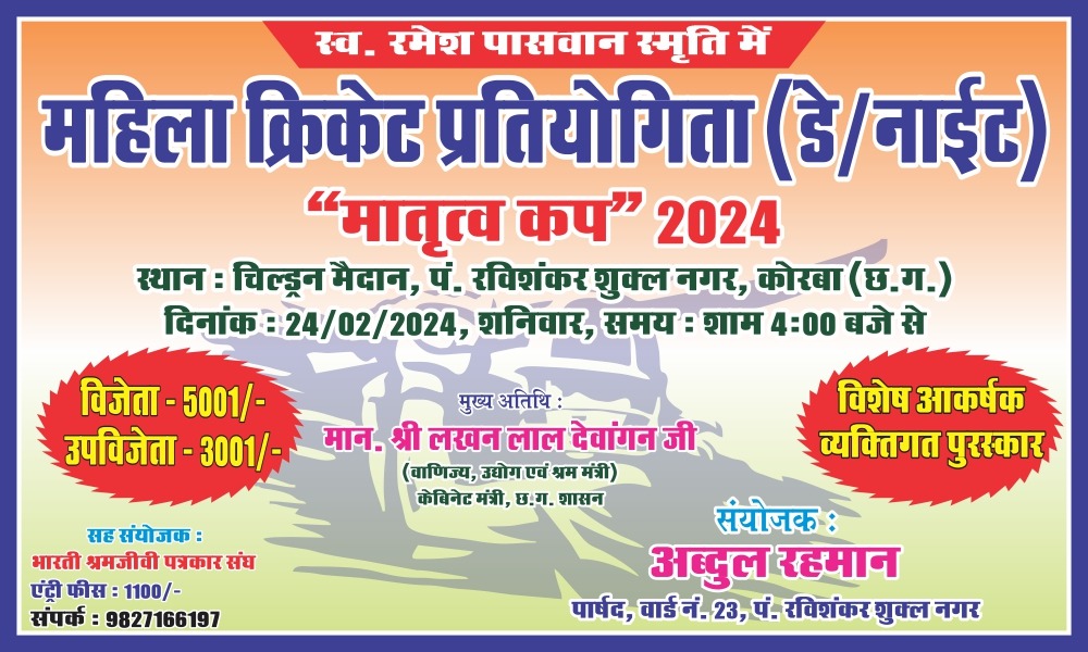 कोरबा: ऊर्जाधानी कोरबा में स्व. रमेश पासवान की स्मृति में महिला क्रिकेट प्रतियोगिता “मातृत्व कप 2024” का आयोजन किया जा रहा है। इस पूरे स्पर्धा का शुभारंभ प्रदेश के वाणिज्य, उद्योग व श्रम मंत्री लखनलाल देवांगन की उपस्थिति में होगा। स्पर्धा की शुरुआत 24 फरवरी को पंडित रविशंकर शुक्ल नगर स्थित चिल्ड्रंस मैदान में होगा। यह आयोजन कोरबा के प्रतिष्ठित पत्रकार समूह भारती श्रमजीवी पत्रकार संघ के तत्वाधान में संपन्न कराया जा रहा है। यह पहला मौका है जब महिलाओं के लिए इस तरह के खेल प्रतिस्पर्धा का आयोजन किया जा रहा है। खेलकूद जैसी गतिविधियों में रुचि रखने वाली महिलाओं में इस पूरे आयोजन को लेकर जबर्दस्त उत्साह देखा जा रहा हैं।