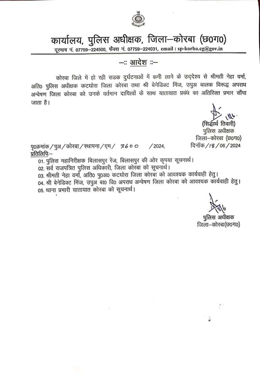 श्रीमान पुलिस अधीक्षक महोदय कोरबा श्री सिद्धार्थ तिवारी द्वारा ज़िला में बढ़ रही सड़क दुर्घटनाओं में कमी लाने और यातायात प्रबंधन में कसावट लाने हेतु श्रीमती नेहा वर्मा अतिरिक्त पुलिस अधीक्षक कटघोरा यातायात प्रबंधन का प्रभार सौपा गया है। तथा श्री बेनेडिक्ट मिंज, उप पुलिस अधीक्षक को अपने वर्तमान दायित्वों के साथ साथ यातायात व्यवस्था का अतिरिक्त काम सौंपा गया है।