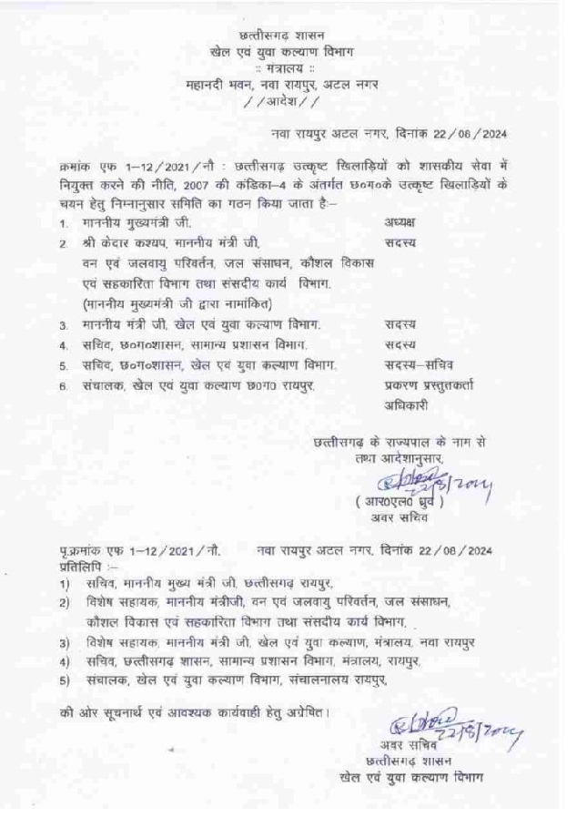 छत्तीसगढ़ के खिलाड़ियों के लिए खुशखबरी है. उत्कृष्ट खिलाड़ियों को शासकीय नौकरी में नियुक्ति देने कमेटी गठित की गई है, जिसके अध्यक्ष मुख्यमंत्री विष्णुदेव साय हैं. वन मंत्री केदार कश्यप और खेल मंत्री टंक राम वर्मा समेत सामान्य प्रशासन विभाग के अधिकारी और खेल युवा कल्याण विभाग के अधिकारी को सदस्य, सचिव बनाए गए हैं. इसका आदेश खेल एवं युवा कल्याण विभाग ने जारी किया है.