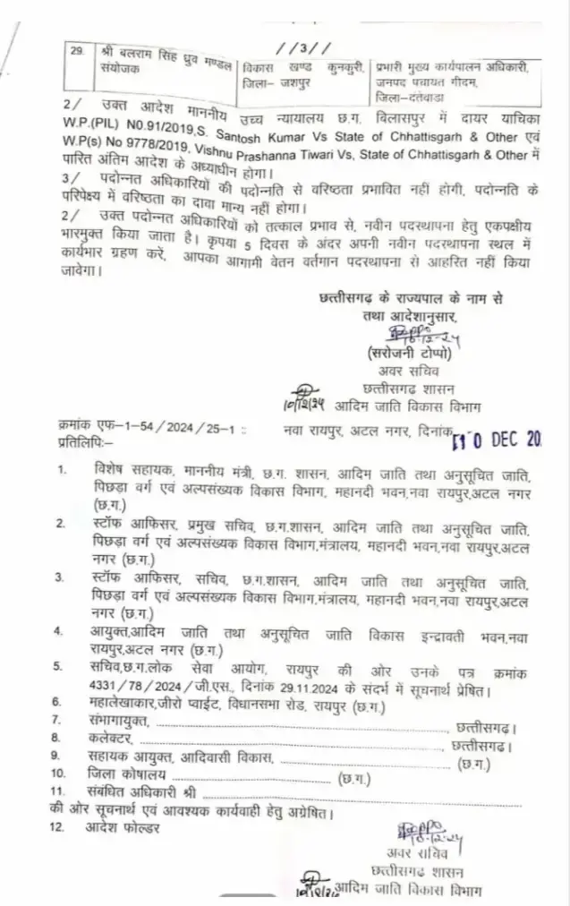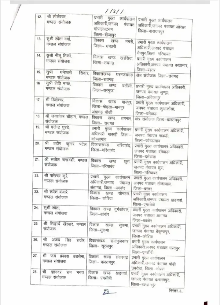 CG CEO transfer breaking जनपद CEO का थोक में तबादला देखें सूची BREKING NEWSछत्तीसगढ़रायपुर 10/12/2024 Updated: 10/12/2024 By Rafiq Memon Share FacebookTwitterPinterestWhatsAppTelegram CG CEO transfer breaking - Advertisement - रायपुर: CG CEO transfer breaking राज्य शासन ने मंडल संयोजक से क्षेत्र संयोजक के पद पर पदोन्नत के साथ तबादला आदेश जारी किया है।करीब पचास से ज्यादा जनपद पंचायत सीईओ इस आदेश से प्रभावित हुए है।- Advertisement - CG CEO transfer breaking रायपुर breaking Previous articleHome remedies to increase hemoglobin शरीर में हीमोग्लोबिन बढ़ाने का चमत्कारिक घरेलु नुस्खाNext articleJCI Legend’s awareness program JCI लीजेन्ड का जागरूकता कार्यक्रम होटल महाराजा में हुआ संपन्न, बेस्ट इन्वेस्टमेंट एवं हेल्थ इन्सुरेंस पर ट्रेनरों ने दिए टिप्स - Advertisement - TagsCG CEO transfer breaking Rafiq Memon Share FacebookTwitterPinterestWhatsAppTelegram Latest news हृदय रोगियों के लिए वरदान बना एनकेएच का कैथलैब, एक दिन में 46 मरीजों का उपचार Rafiq Memon - - Advertisement - शोक समाचार : वेदांता ग्रुप के चेयरमैन अनिल अग्रवाल के 49 वर्षीय पुत्र अग्नि का निधन, श्री अग्रवाल ने कहा आज मेरे जीवन... Rafiq Memon - BALCO health camp organised बालको ने किया मल्टी-स्पेशलिटी स्वास्थ्य शिविर का आयोजन Rafiq Memon - State level cricket tournament : कोरबा में क्रिकेट इतिहास रचेगा मीना जैन मेमोरियल क्रिकेट टूर्नामेंट,आज से शुरू होगा राज्य स्तरीय टूर्नामेंट Rafiq Memon - Related news हृदय रोगियों के लिए वरदान बना एनकेएच का कैथलैब, एक दिन में 46 मरीजों का उपचार शोक समाचार : वेदांता ग्रुप के चेयरमैन अनिल अग्रवाल के 49 वर्षीय पुत्र अग्नि का निधन, श्री अग्रवाल ने कहा आज मेरे जीवन... BALCO health camp organised बालको ने किया मल्टी-स्पेशलिटी स्वास्थ्य शिविर का आयोजन State level cricket tournament : कोरबा में क्रिकेट इतिहास रचेगा मीना जैन मेमोरियल क्रिकेट टूर्नामेंट,आज से शुरू होगा राज्य स्तरीय टूर्नामेंट - Advertisement -
