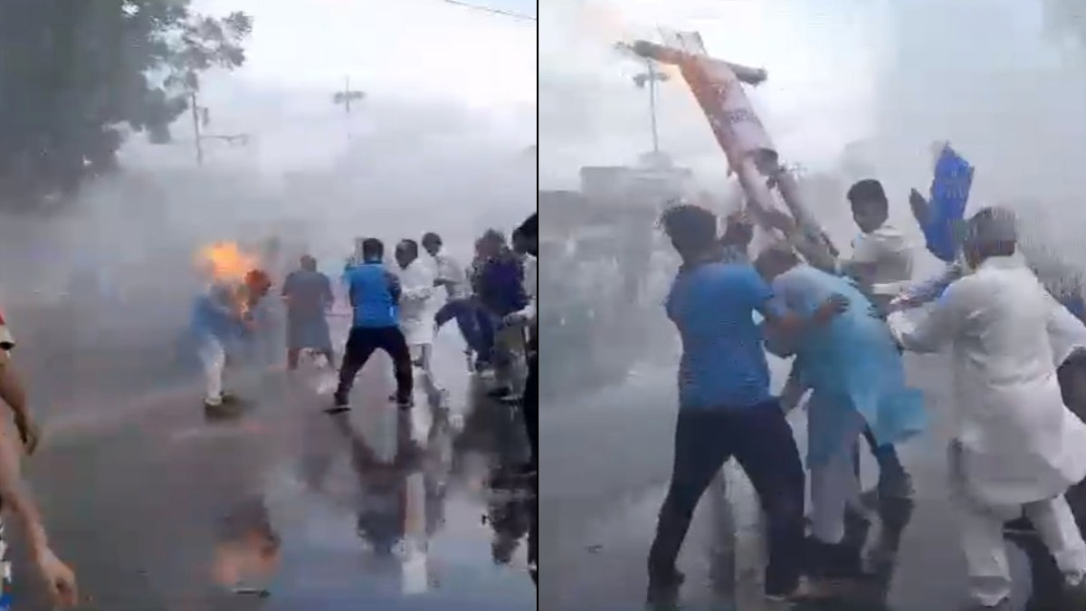 पुतला जलाते समय कांग्रेस नेता के कुर्ते में लगी आग: प्रदर्शन के दौरान हुआ हादसा, बाल बाल बचे,