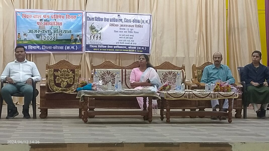 कोरबा 13 जून 2024/ श्री सत्येन्द्र कुमार साहू, प्रधान जिला एवं सत्र न्यायाधीश एवं अध्यक्ष जिला विधिक सेवा प्राधिकरण कोरबा के निर्देशानुसार 12 जून 2024 को विश्व बाल श्रम निषेध दिवस के अवसर पर श्रम कल्याण केन्द्र, (जुनियर क्लब) सी.एस.ई.बी. कॉलोनी दर्री कोरबा में विधिक जागरूकता का कार्यक्रम का आयोजन किया गया।