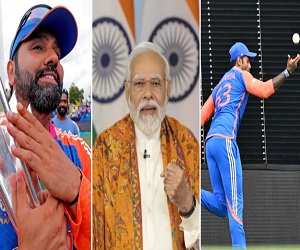 हर भारतीय फैन अपने-अपने अंदाज में रोहित ब्रिगेड को जीत की बधाई दे रहा है। पीएम नरेंद्र मोदी ने भी शनिवार देर रात मैच के बाद सोशल मीडिया पर टीम इंडिया को जीत की बधाई दी थी। रविवार को उन्होंने टीम इंडिया को फोन लगाया और जीत की बधाई दी। पीएम मोदी ने रोहित शर्मा से बात की। पीएम मोदी ने रोहित से विराट कोहली की शानदार इनिंग और सूर्य कुमार यादव के आखिरी ओवर में रोमांचक कैच की तारीफ भी की।