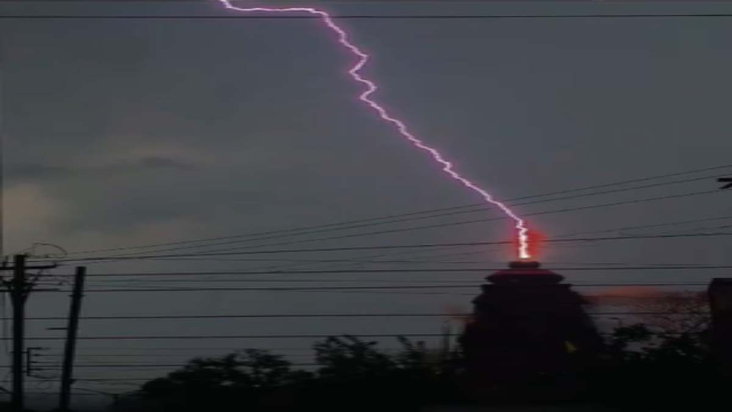 कोंडागांव में पिछले एक घंटे से मुसलाधार बारिश हो रही है. लोग कैमरे में इस बारिश का वीडियो बना रहे. राम मंदिर के सामने छत से युवक बारिश का वीडियो बना रहा था, तभी आसमान से कड़कती बिजली राम मंदिर के गुंबद से टकराता दिखा, जिसे युवक ने अपने मोबाइल के कैमरे में कैद कर लिया.