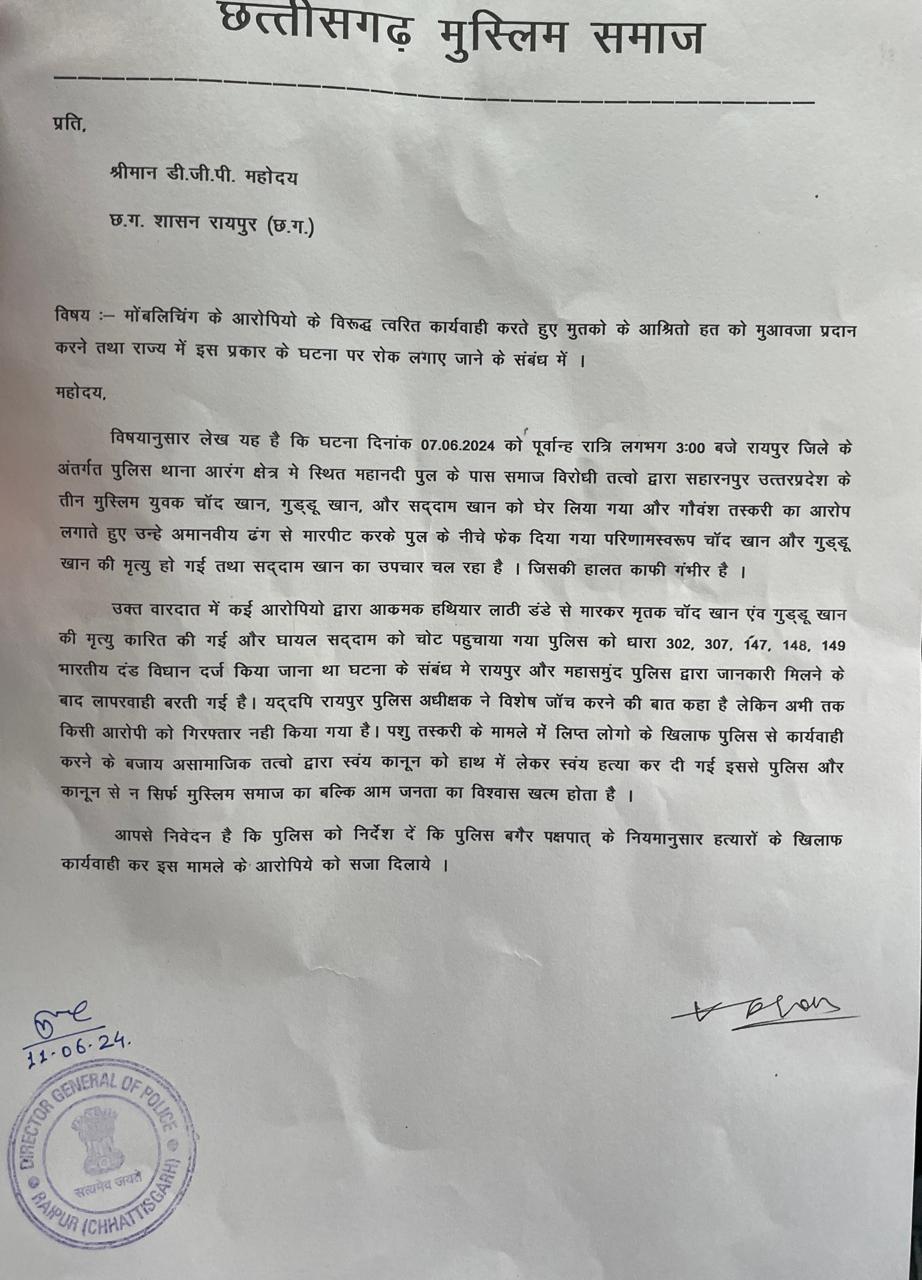 मुस्लिम समाज के ज्ञापन में कहा गया है कि हथियार लाठी डंडे से मारकर चाँद खान एंव गुड्डू खान की मृत्यु कारित की गई और घायल सद्दाम को चोट पहुंचाया गया। इस मामले में पुलिस को धारा 302, 307, 147, 148, 149 भारतीय दंड विधान के तहत जुर्म दर्ज किया जाना था, मगर घटना के संबंध मे रायपुर और महासमुंद पुलिस द्वारा जानकारी मिलने के बाद लापरवाही बरती गई है। यद्दपि रायपुर पुलिस अधीक्षक ने विशेष दल से जांच कराने की बात कही है, लेकिन अभी तक किसी भी आरोपी को गिरफ्तार नहीं किया गया है। पशु तस्करी के मामले में लिप्त लोगों के खिलाफ पुलिस से कार्यवाही कराने की बजाय असामाजिक तत्वों द्वारा स्वयं कानून को हाथ में लेकर उनकी हत्या कर दी गई। ऐसे में पुलिस और कानून से न सिर्फ मुस्लिम समाज का बल्कि आम जनता का विश्वास खत्म होता है और असामाजिक तत्वों के हौसले बुलंद होते हैं। प्रतिनिधिमंडल ने डीजीपी से अनुरोध किया है कि वे पुलिस को निर्देश दें कि बगैर पक्षपात के नियमानुसार हत्यारों के खिलाफ कार्यवाही कर इस मामले के आरोपिये को सजा दिलाये।