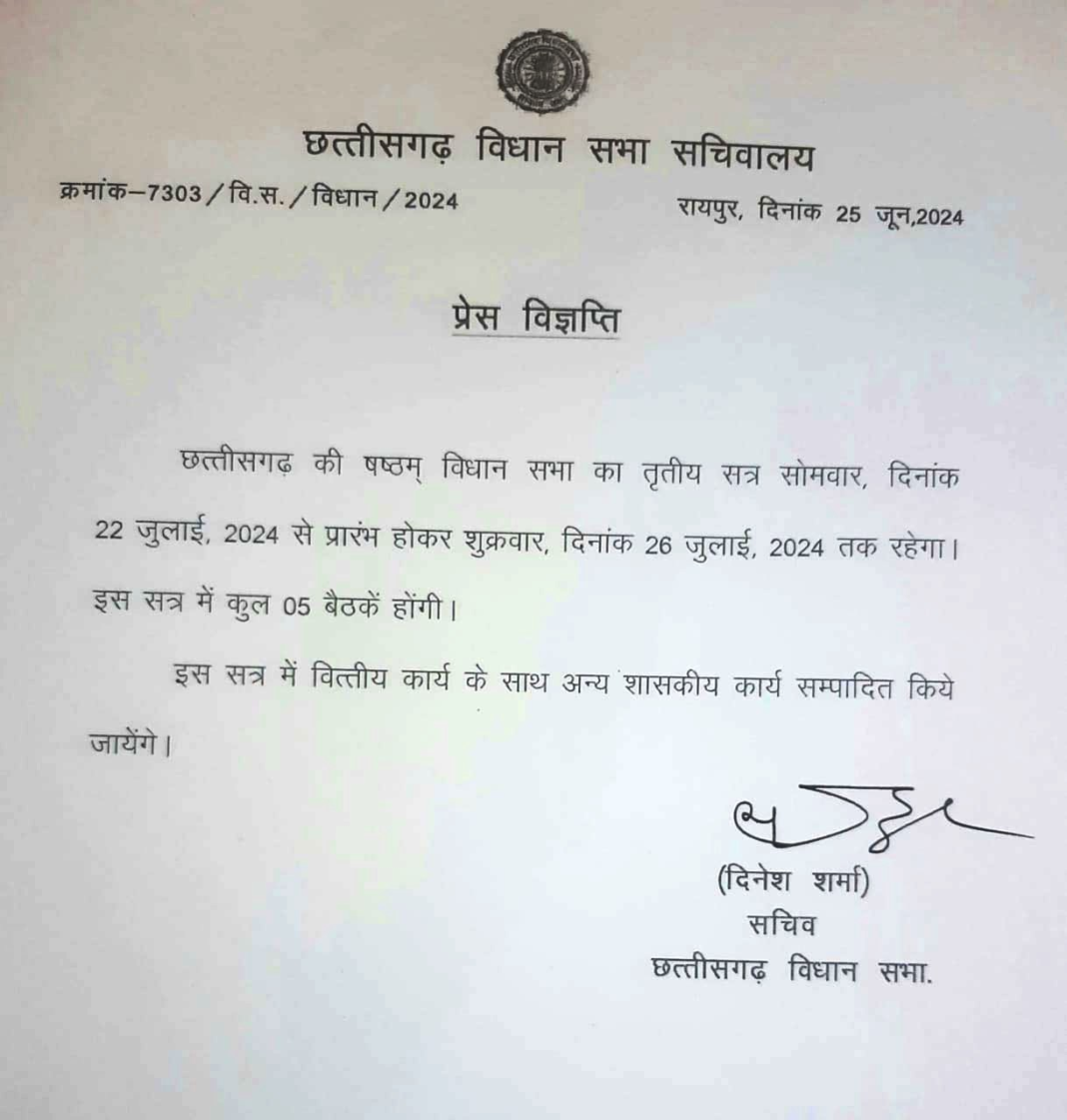 रायपुर। छत्तीसगढ़ विधानसभा का मानसून सत्र की औपचारिक घोषणा हो गई. सत्र 22 जुलाई से शुरू होकर 26 जुलाई तक चलेगा. सत्र के दौरान कुल पांच बैठकें होंगी, जिसमें सरकार अनुपूरक बजट पेश करने के साथ कुछ संशोधन विधेयक भी ला सकती है.