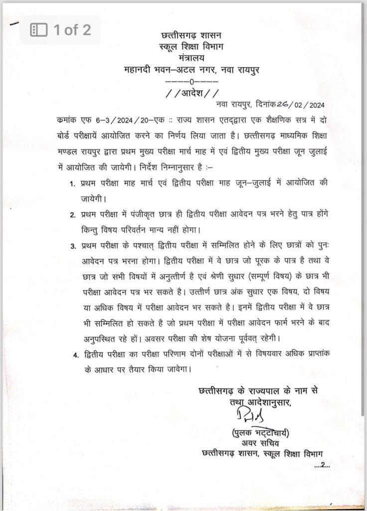 Board Exam: रायपुर। स्कूल में हर बच्चे को बोर्ड एग्जाम (Board Exam) की टेंशन होती है. लेकिन अब ये टेशन कम होने वाली है. क्योंकि अब छात्र साल में दो बार बोर्ड एग्जाम दे सकेंगे. जी हां, राज्य शासन ने 10वीं और 12वीं की परीक्षाओं को साल में दो बार आयोजित कराने का निर्णय लिया है. स्कूल शिक्षा विभाग की ओर से जारी आदेश के मुताबिक, छत्तीसगढ़ माध्यमिक शिक्षा मण्डल रायपुर द्वारा प्रथम मुख्य परीक्षा मार्च माह में एवं द्वितीय मुख्य परीक्षा जून जुलाई में आयोजित की जायेगी