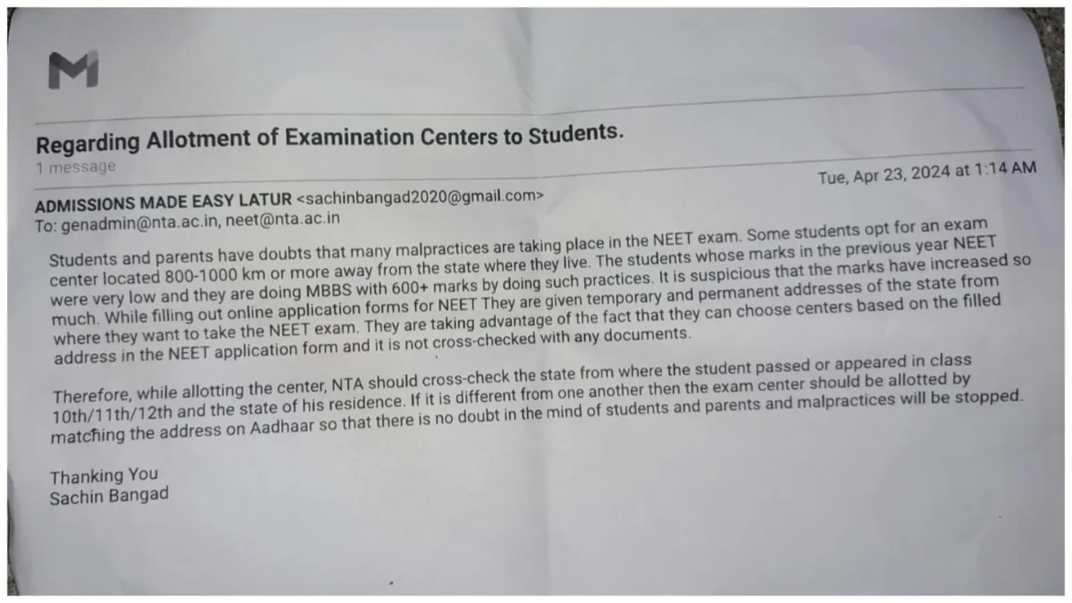 उन्होंने उदाहरण दिखाते हुए बताया कि कुछ बच्चों के 2022 में कम नंबर आए थे। लेकिन 2023 में उन्होंने कर्नाटक के बेलगावी में परीक्षा दी और उन्हें बहुत बढ़िया नंबर मिले। देशमुख ने आगे बताया कि इन्हीं सब की वजह से हमने एनटीए को अलर्ट किया था। एनटीए की तरफ से कोई जवाब नहीं मिला। देशमुख ने ईमेल तब लिखा था जब नीट परीक्षा नहीं हुई ती। अगर एनटीए ने थोड़ी जागरूकता दिखाई होती तो शायद परीक्षा के नतीजों की तस्वीर कुछ और होती।