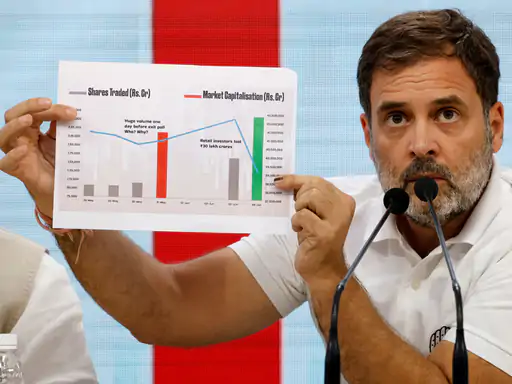राहुल गांधी ने गुरुवार को प्रेस कॉन्फ्रेंस कर 4 जून रिजल्ट डे पर स्टॉक मार्केट की गिरावट को बड़ा घोटाला बताया। उन्होंने इसकी जेपीसी (जॉइंट पार्लियामेंट्री कमेटी) से जांच कराने की मांग की है।