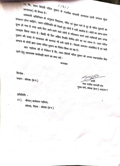 बता दें कि इस संबंध में वार्ड क्रमांक 12 की पार्षद श्रीमती सुलोचना यादव ने भी अपनी सहमति दी है और पत्र लिखा है। इनके अलावा जिला चेम्बर ऑफ कॉमर्स एंड इंडस्ट्रीज, रोटरी क्लब कोरबा, मध्य नगरीय व्यापारी संघ, सरस्वती शिशु मंदिर पुराना बस स्टैंड, गुरु सिंह सभा इतवारी बाजार, श्री श्याम मित्र मंडल, श्री पंचदेव मंदिर सेवा समिति, श्री श्वेतांबर जैन समिति, श्री राम जानकी मंदिर पुराना बस स्टैंड की तरफ से भी पत्राचार कर शराब दुकान कहीं और शिफ्ट करने की मांग की गई है।