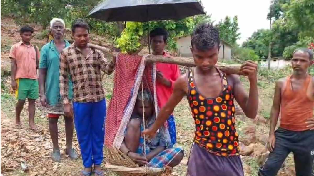 जशपुर. आजादी के 75 साल बीतने के बाद भी जशपुर जिले में कुछ ऐसे भी गांव है, जहां सड़क के आभाव में एंबुलेंस नहीं पहुंच रही. लोग आज भी मुख्य सड़क तक पहुंचने कांवड़ और पालकी का सहारा लेकर लंबी दूरी तय करते नजर आ रहे हैं. ताजा मामला मुख्यमंत्री विष्णु देव साय के गृह जिला जशपुर से आया है, जहां के ग्राम पंचायत मरंगी के चुरीलकोना में आज एक गंभीर रूप से बीमार वृद्ध मरीज को पालकी में बिठाकर अस्पताल ले जाने के लिए मुख्य सड़क तक लाया गया.इस गांव में सड़क की सुविधा नहीं होने से गर्भवती महिला या फिर अन्य मरीजों को आज भी मुख्य सड़क तक ले जाने के लिए लोग कांवड़ और पालकी का सहारा लेते हैं. छत्तीसगढ़ की सरकार भले ही आदिवासी बाहुल्य क्षेत्र जशपुर में विकास के लाख दावे करती है, लेकिन जमीनी हकीकत कुछ और ही बयां करती है. इस क्षेत्र के ग्रामीण आज भी अपने गांवों में मूलभूत सुविधाओं के लिए तरस रहे हैं. इन गांवों में ना स्वास्थ्य सुविधा और न ही सड़क है. यही वजह है कि जशपुर के अंदरूनी ग्रामीण अंचलों में आज भी आदिवासियों की जिंदगी एक पालकी पर टिकी हुई है.