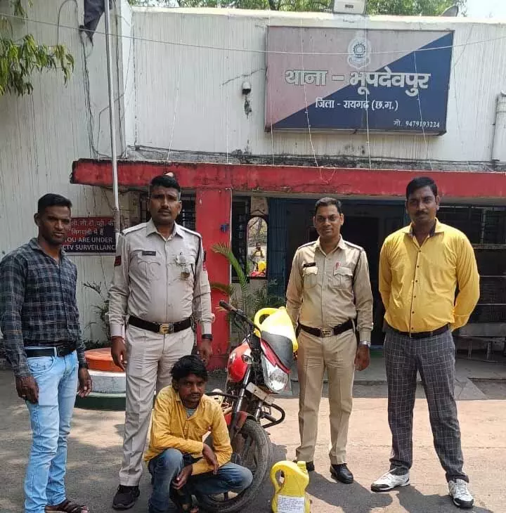 रायगढ़। भूपदेवपुर पुलिस द्वारा ग्राम कांशीचुआ बस्ती चौक के पास मुखबीर सूचना पर बिना नम्बर मोटर सायकल सुजुकी हयाते पर शराब परिवहन कर रहे आरोपी दिनेश साहू पिता कंचन प्रसाद साहू (उम्र 35 वर्ष) साकिन कांशीचुआ थाना भूपदेवपुर जिला रायगढ़ को पकड़ा जिसके कब्जे से 09 लीटर महुआ शराब और अवैध परिवहन में प्रयुक्त मोटर सायकल की जप्ती की गई है। आरोपी दिनेश साहू के कृत्य पर थाना भूपदेवपुर में धारा 34(2),59(क) आबकारी एक्ट की कार्रवाई किया गया है। थाना प्रभारी भूपदेवपुर निरीक्षक रामकिंकर यादव के नेतृत्व पर शराब रेड कार्रवाई में प्रधान आरक्षक शंभू पाण्डेय, आरक्षक बोधराम सिदार, विजय कुमार पटेल, कृष्ण कुमार वारेन और महिला आरक्षक गौरी सिदार शामिल थे।
